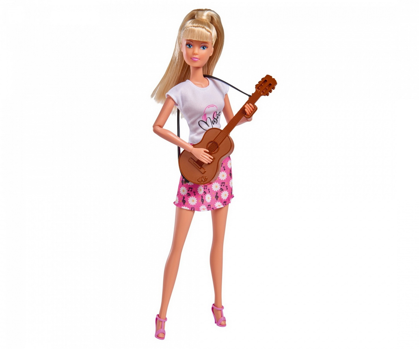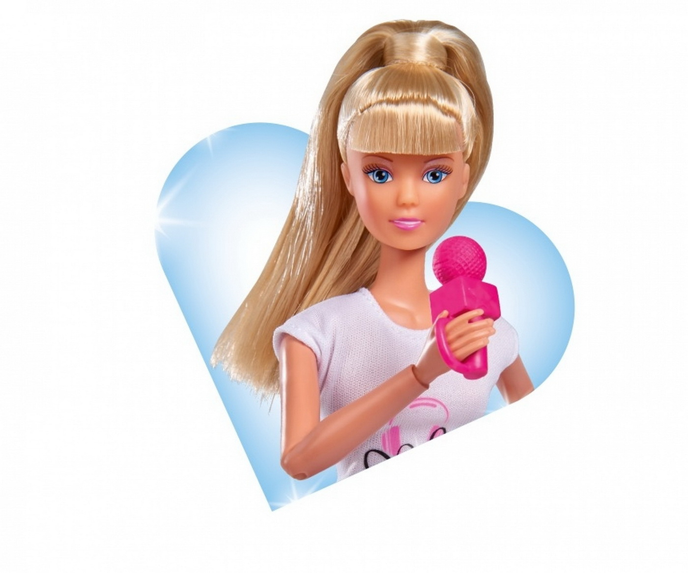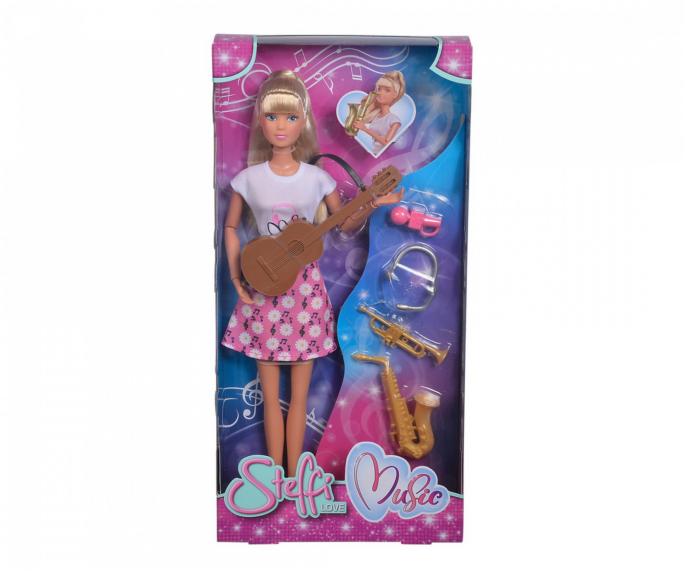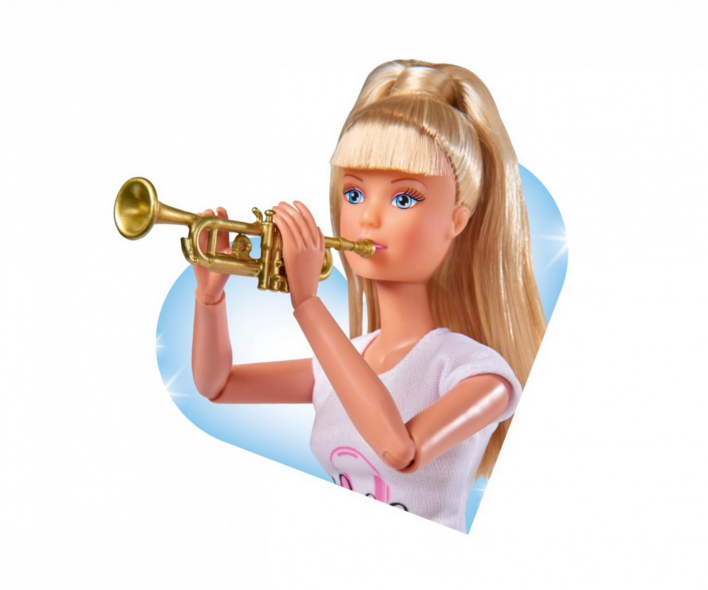 Papusa Steffi este imbracata intr-o fusta scurta cu tricou si canta la instrumentele ei favorite. Setul include o chitara, o trompeta, un saxofon, casti si un microfon. Inaltime papusa 29cm