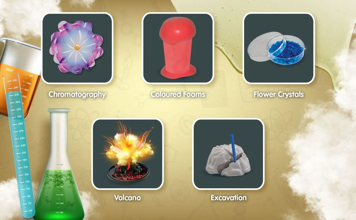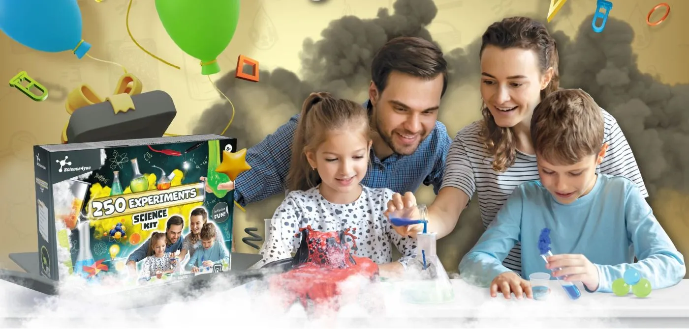 Exploreaza fascinanta lume a stiintei si descopera cele 250 de experimente pregatite pentru tine! Acest ULTRA SET STIINTIFIC 250 EXPERIMENTE include peste 60 de componente si ofera distractie fara sfarsit pentru luni intregi! Distreaza-te creand reactii chimice colorate, vulcani in eruptie, cristale stralucitoare, slime lipicios, exploreaza cromatografia si multe altele! Continutul kitului (prima parte) colorant galben, colorant rosu, cutie Petri, agrafe, palnie, spatula de plastic, pipete Pasteur, ghiveci, pahar gradat, bila, tabla de excavatie, turba, benzi de cauciuc, manusi, ochelari de protectie, eprubete cu capac, bile de bumbac, benzi pH, dalta, sfoara din lana, elastic gros, hartie de filtru, motor mic, fire electrice, capace pentru pahare mici gradate, LED, spatule mici din lemn, pahare mici gradate, baloane, matrita pentru sfere, bete din lemn, paie, fire modelabile, seminte de fasole verde, psyllium, agar-agar, forma de vulcan, banc de lucru pentru laborator.